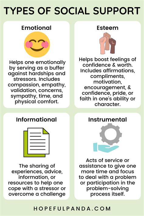 Emotional support involves the provision of empathy, love, and compassion. This type of support is essential for helping individuals manage their emotional well-being, whether they're facing a personal crisis, dealing with a loss, or simply needing someone to listen. Emotional support networks often consist of close friends, family members, and significant others, who offer a safe space for individuals to express their emotions and receive comfort and reassurance.